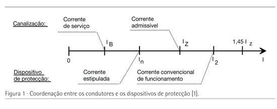 Em que IB é a Corrente de serviço na canalização, Iz a Corrente admissível na canalização e In a Corrente estipulada do dispositivo de protecção. Na Figura 1 é apresentado um esquema destas condições [1]: