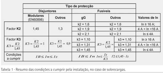Sabendo que um aumento da secção do cabo origina custos acrescidos para a instalação e sabendo também que as protecções do sistema têm que acompanhar a corrente do sistema, o projectista tem que verificar também outras condições consoante o tipo de protecção instalada. A Tabela 1 apresenta um resumo dessas condições: