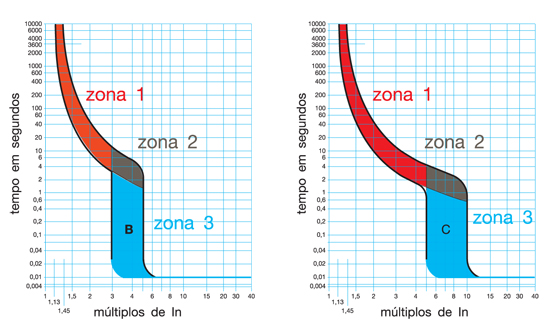 A actuação do disjuntor depende da temperatura a que se encontra. A parte inferior das curvas são as curvas a quente e a superior são as curvas a frio. O disjuntor tem tempos de abertura diferentes com o tempo de utilização em carga, pois todos os metais percorridos por correntes a uma temperatura normal de utilização sofrem perdas por calor, denominadas de Perdas por efeito de Joule, logo, quanto maior for o tempo de utilização do produto, maior será essa temperatura interna dos materiais. Nestes gráficos existem 3 tipos de zonas: