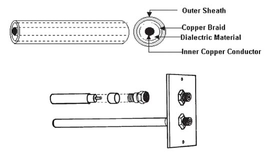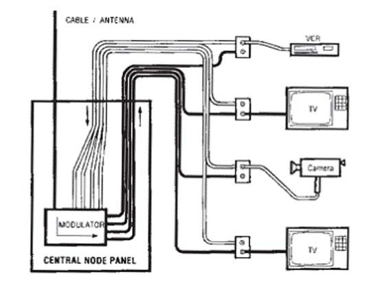 Existem essencialmente 2 tipos de cabos coaxiais: o RG-59 e o RG-6. O primeiro é suficiente para transmitir áudio e vídeo, no entanto, apresenta fortes percas de sinais de alta frequência quando comparado com o RG-6. Na figura, o modulador serve para receber os sinais dos vários emissores (vídeo, câmara, entre outros) (cablagem a branco) e injectá-los na cablagem de distribuição (TVs) (cablagem a preto).